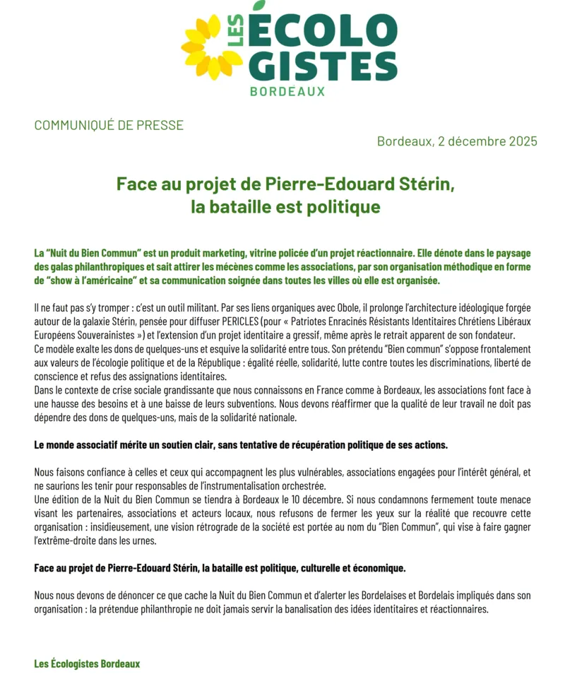 Notre communiqué de presse intitulé « Face au projet de Pierre-Edouard Stérin, la bataille est politique », publié ce mardi par Les Écologistes Bordeaux.