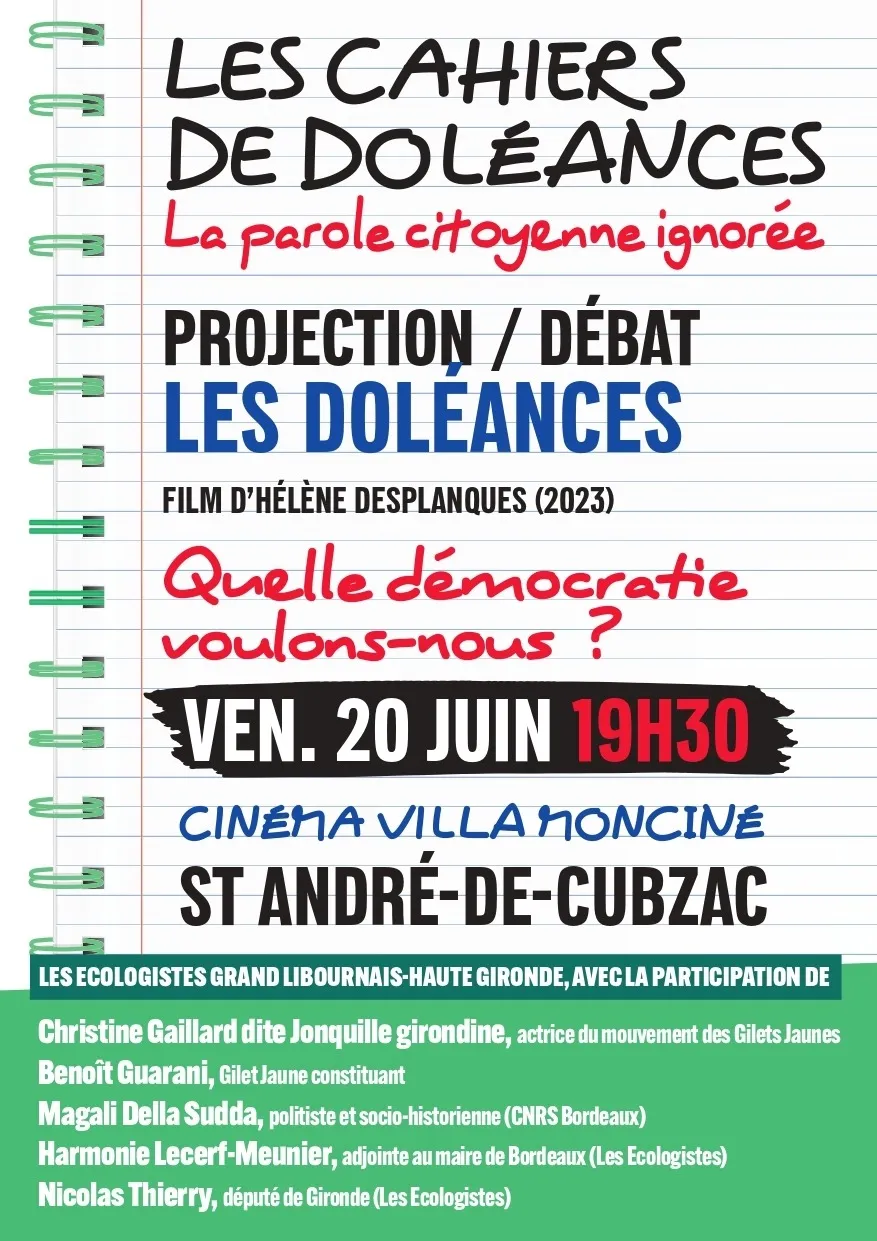 Pourquoi cette soirée : Riche en propositions concrètes pour plus de justice sociale et de considération, cette parole citoyenne a été totalement niée et oubliée.À partir de ce film et à travers le débat, nous Les Écologistes du Grand Libournais-Haute Gironde, souhaitons dénoncer ce déni démocratique. Nous voulons redonner la parole aux personnes qui ont contribué à ces cahiers et à ce mouvement populaire.Notre intention est de soutenir une vision de la démocratie plus participative et plus directe. Une démocratie dans laquelle les citoyennes et citoyens ont la capacité de peser sur les choix qui les concernent, pour plus de justice sociale, écologique et démocratique.